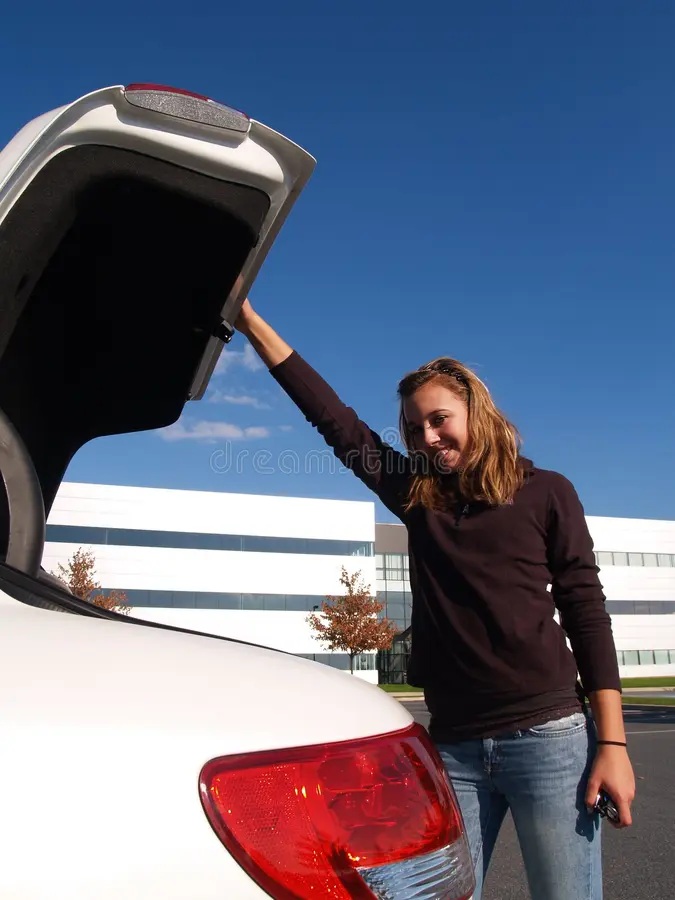 She had parked at the far corner of the lot, away from the street lights. She popped the trunk, pulled out a black trash bag and thrust it at me. “Clothes, shoes, wallet, phone. ” She stood back with arms crossed, waiting. It was a dare. I looked around and seeing nobody, I took the dare. She took back the bag and put it in the front seat of the car then closed the door and put me in the trunk. Three zip ties and I was in a hogtie – and then the tape around my head made speaking and seeing impossible. She smiled and closed the trunk. I heard her walk away. It felt like hours before she finally came back, started the car and drove off.