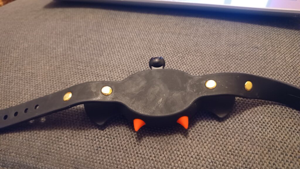 It should be noted that the shocks are actually felt though the small copper buttons set in the collar straps, not the actual device. It makes it slightly more difficult to adapt the device to being worn around the cock and balls than the neck as intended as the design makes me hesitant to cut and shorten the collar straps past the buttons. And so far I’ve been hesitant to cut off the goofy bat wings and horns as well, though I’m fairly sure they are purely cosmetic.