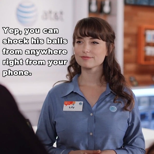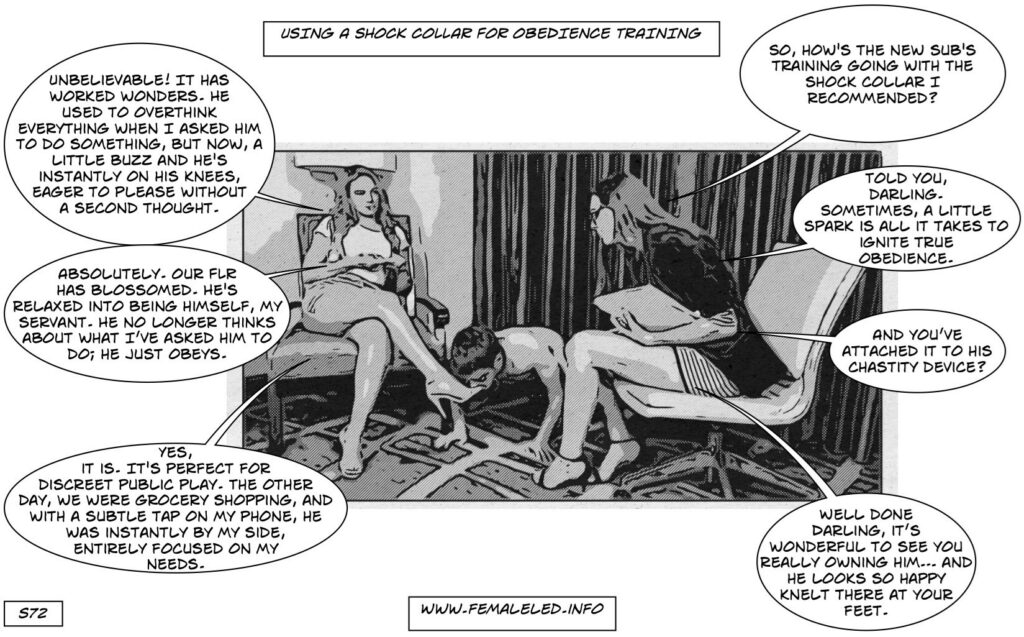 there is a chastity device and a remote controlled shock collar controlled by a woman.